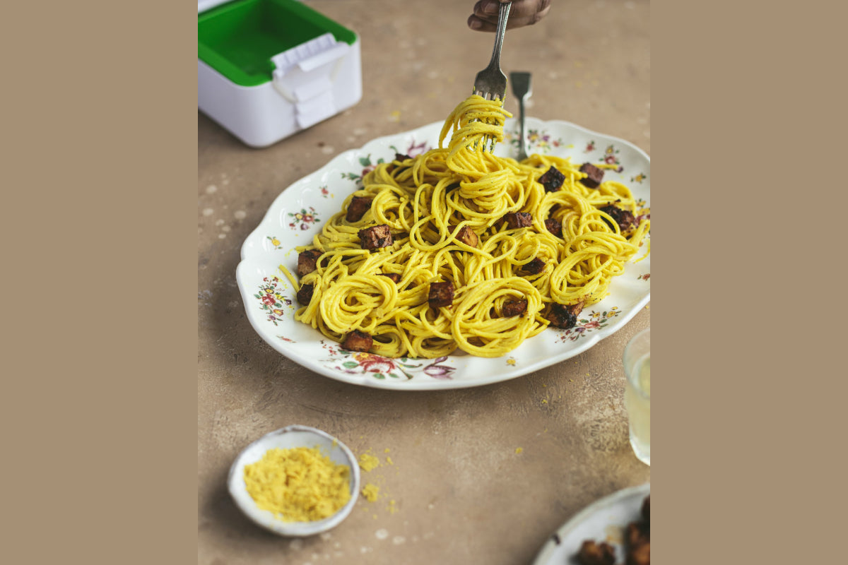 Carbonara is a Italian pasta dish traditionally made with cubes of pork in an egg yolk sauce served and with grated hard cheese. This isn't a dish that had landed in my corner of small-town Britain before I turned veggie as a teenager so I realised I've never actually tried it. This vegan version is therefore an approximation, but it tastes pretty divine all the same. For the bacon bits, we have used our popular Smoky Sweet Marinade for the tofu and cut the strips into small pieces but for speed you can substitute with shop-bought bacon. The sauce is rich, smooth and creamy, with a suggestion of egg, it's not a flour-based white sauce, so the Carbonara Gods have allowed us to use their hallowed name.