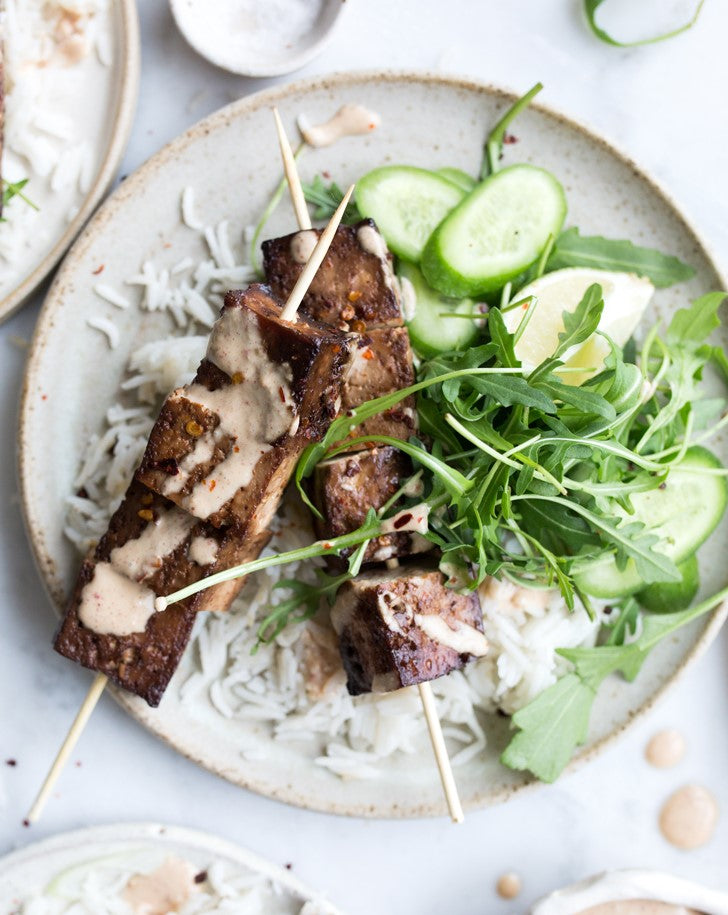 - Insert skewers and serve on a bed of rice along with stir-fried, chinese greens, kale, pak choi, cavolo nero or spinach. You can steam them or for our favourite super-tasty, garlicky greens wash, cut up and fry in a splash of toasted sesame oil with minced garlic until dark green and shiny. Sprinkle with a little water to avoid sticking, add a glug of tamari and a squeeze of lemon juice when cooked and serve immediately.