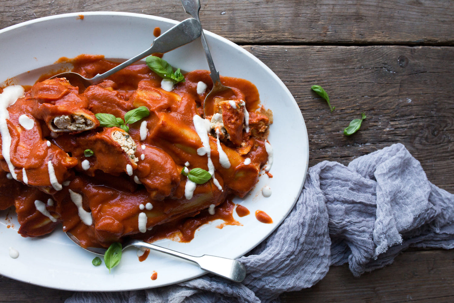 This simple and tasty vegan cannelloni is more substantial than the traditional, cheese-filled version and much lower in fat. The dish combines the richness of a herby tomato sauce with the creamy-soft, umami tofu ricotta. We used shop bought cannelloni tubes, which are generally vegan but check the label, so although it’s a bit fiddly stuffing the tubes, you can do it while the tomato sauce is cooking and the preparation is quite straightforward. The ricotta-filled tubes in the rich sauce combine classic Italian flavours when paired with a simple, green salad to make you feel like you’re dining by the Mediterranean Sea.