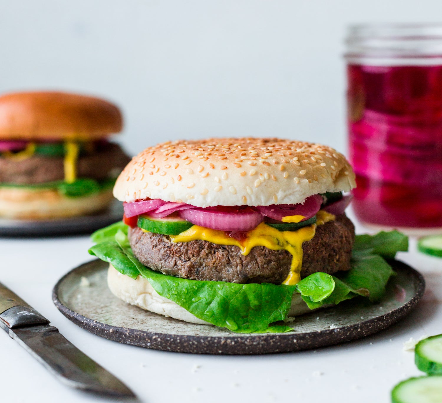 - Do the same with the rest of the burger mix - you should be able to make about 8 decent-sized burgers. Heat up some vegetable or sunflower oil in a frying pan and shallow fry on a medium heat until brown on both sides, turning half way through cooking. Drain on a kitchen towel and serve in a bun with salad and pickles.