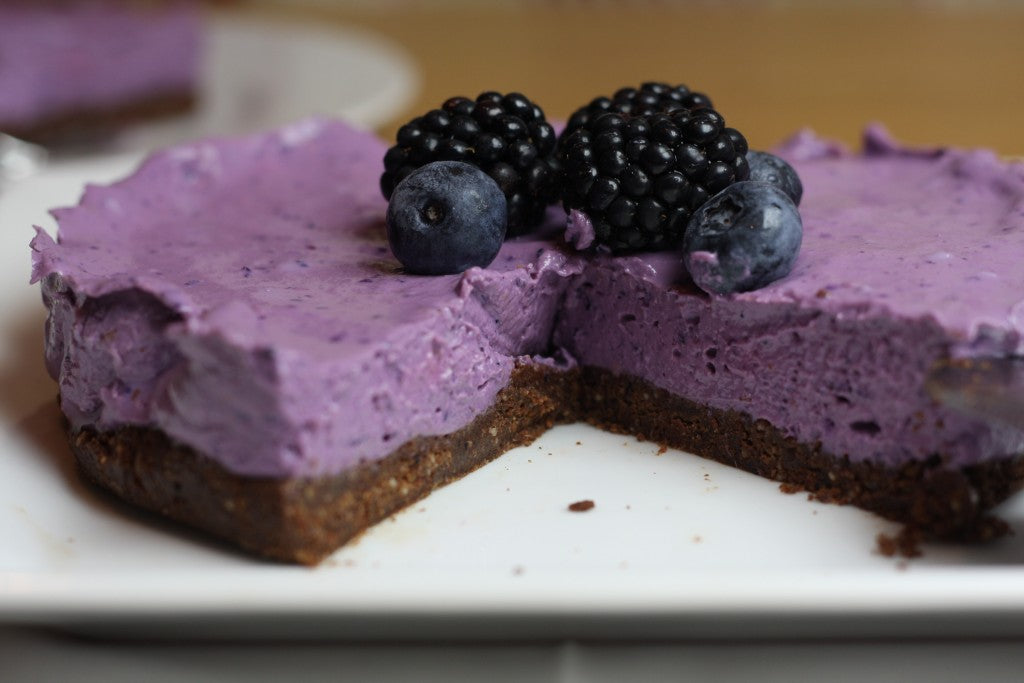 - Whizz the topping ingredients together and pour over prepared cake base. Chill for at least ½ hour to set before serving. Top with fresh blackberries