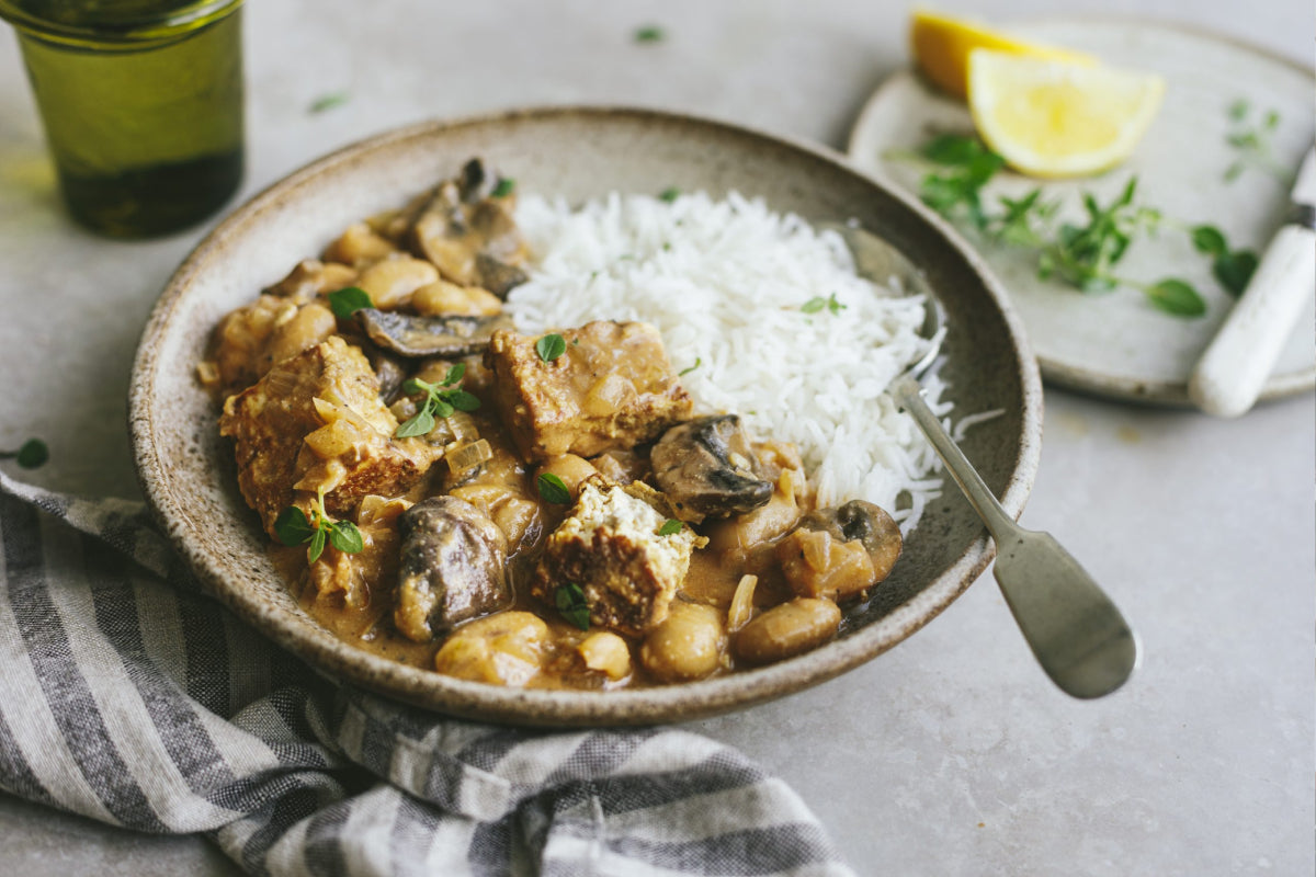 - Finely chop the onion and garlic and fry gently in olive oil for 3-5 minutes. Add the sliced mushrooms and continue cooking until the mushrooms soften. Combine the miso and mustard with the water and whisk together with a fork to combine. Add to the frying pan along with the drained butter beans and simmer gently, continuing to mix. Finally, add the baked tofu cubes and stir to combine and heat through.