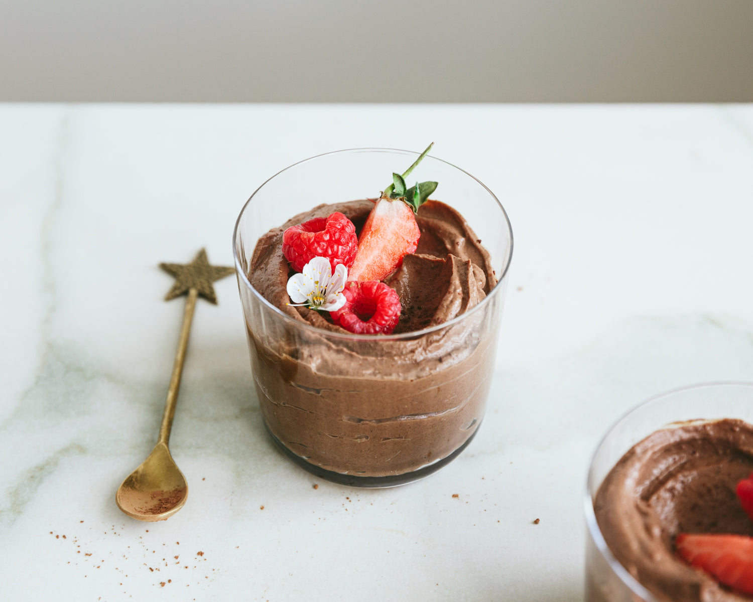 - Mix until fully incorporated and silky smooth and pour into individual containers – we use shot glasses – and decorate with fresh fruit and extra grated chocolate. Refrigerate until ready to eat, preferably chill for an hour.