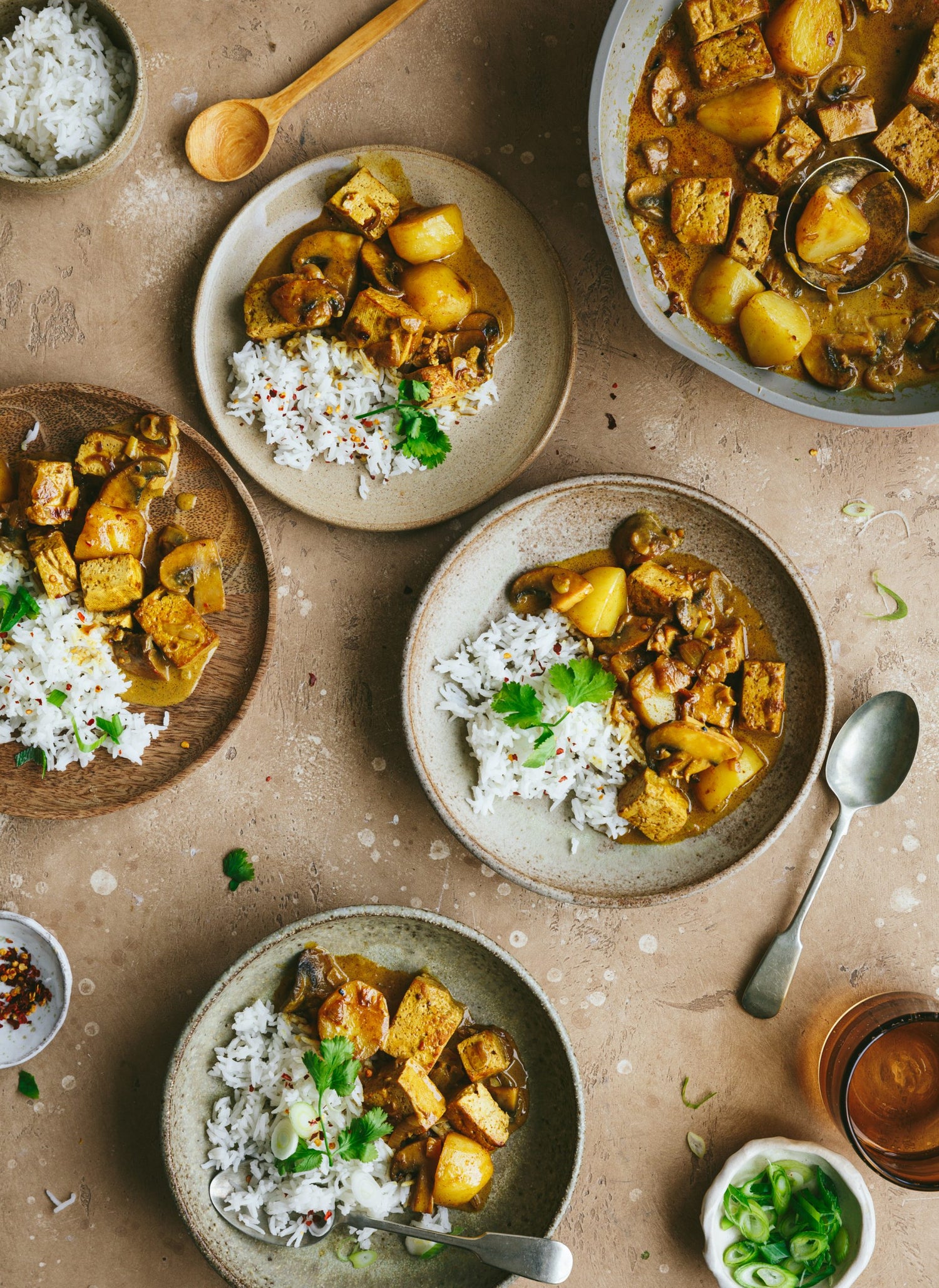 - Fry the shallots on a medium heat in a wok or large frying pan to soften them and then add the garlic and dried chillies. Fry for a minute longer and add the cubed tofu followed by the curry powder and Chinese five spice or your home-spun spice mix. Turn up the heat to high. Next, add the potatoes and mushrooms and stir. Cook on high until the tofu is starting to brown, tossing it in the wok so it doesn’t catch.