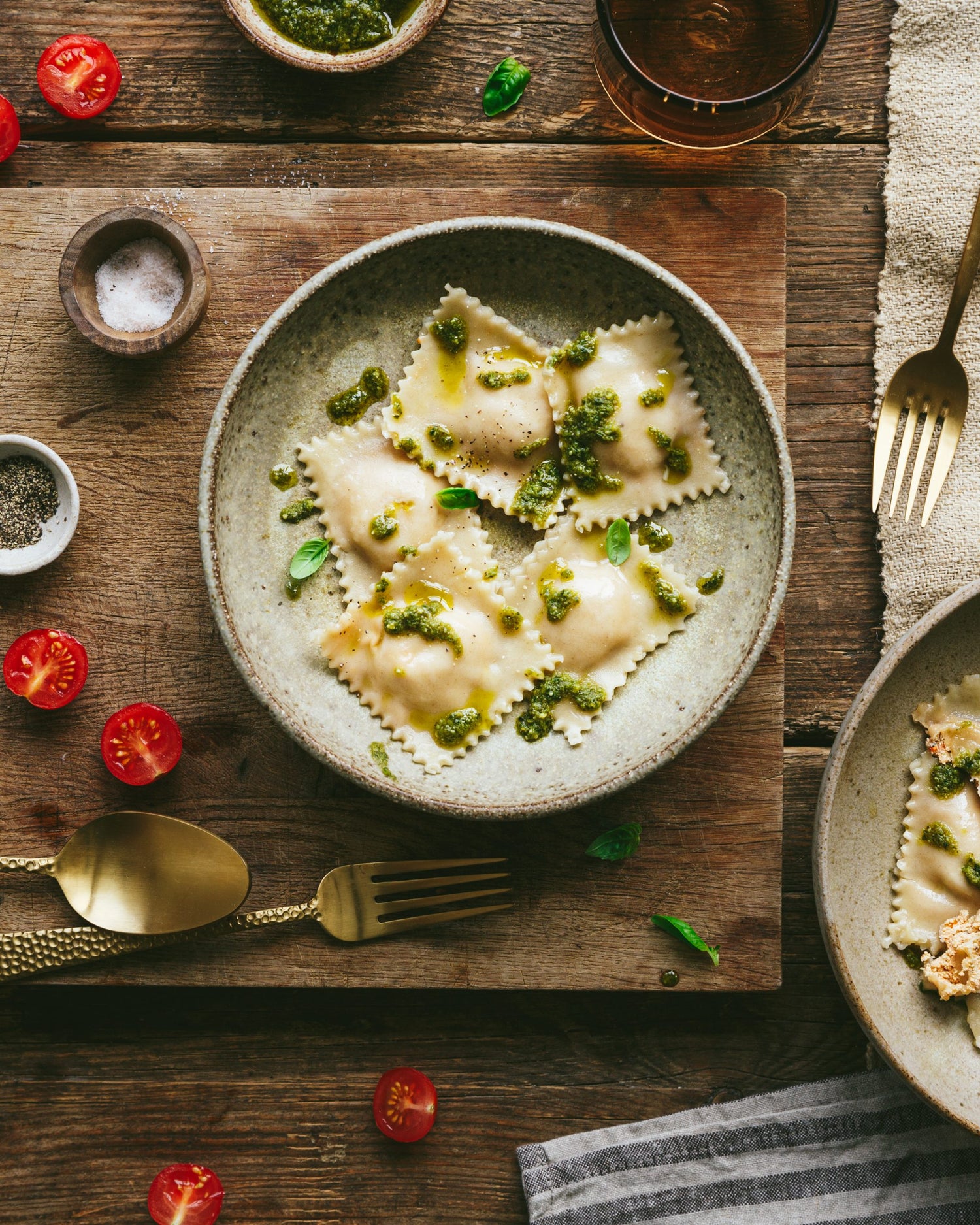 Sun-Dried Tomato and Tofu Ravioli in Pesto